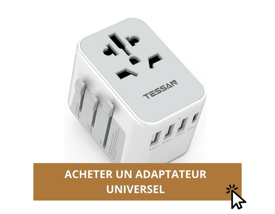 - bonus : une double prise à brancher sur l’adaptateur car parfois il n’y a que une prise dans la chambre d’hôtel